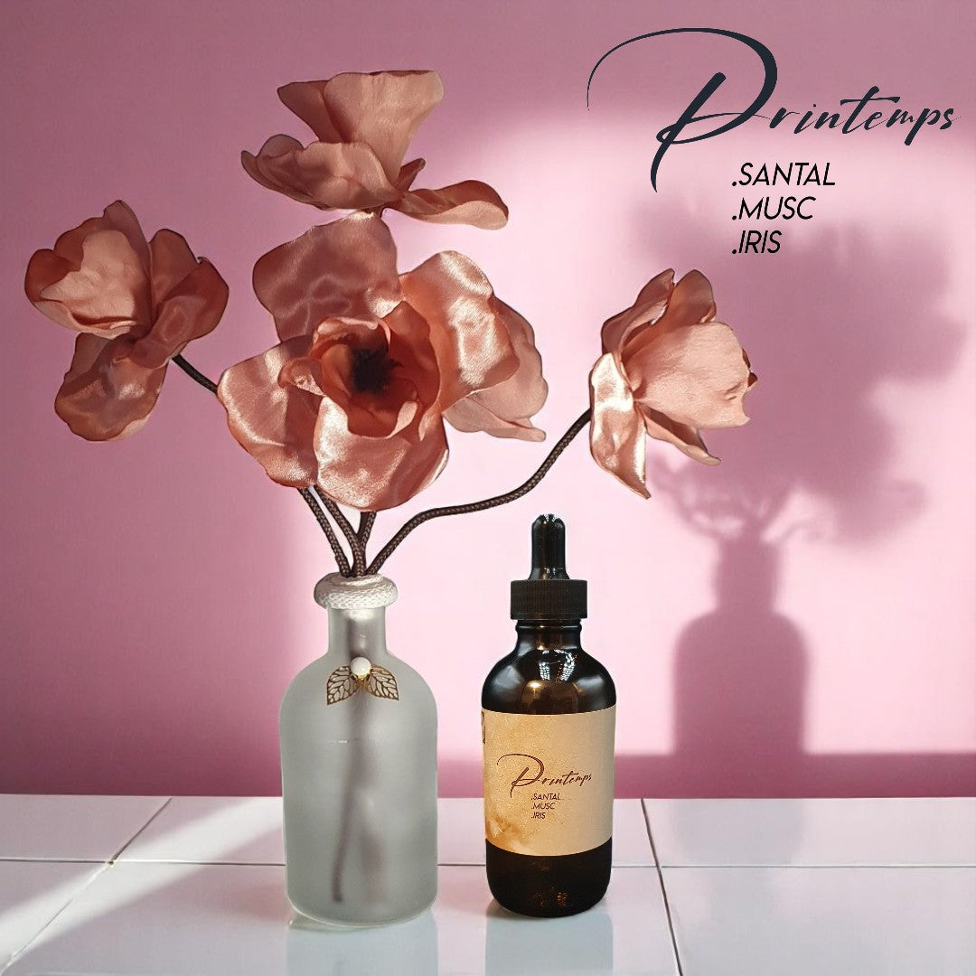 Vase avec 5 fleurs en satin + Flacon Parfum pipette en verre120 ml.