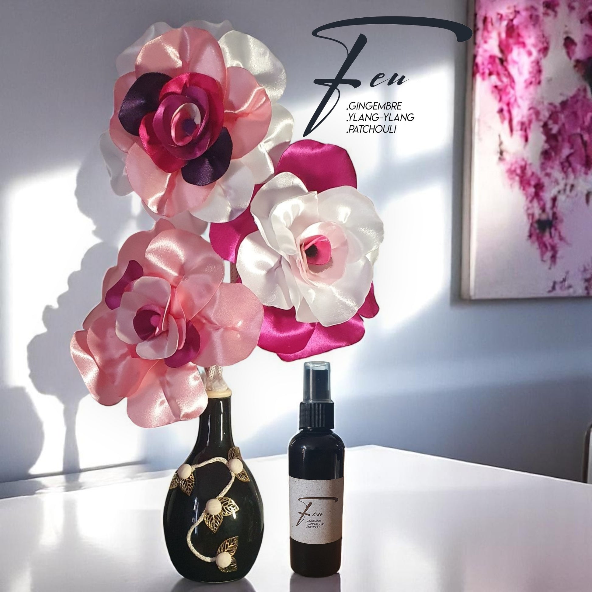 Vase avec 3 grosses fleurs en satin et Flacon Parfum d' Ambiance spray en PET 100 ml.
