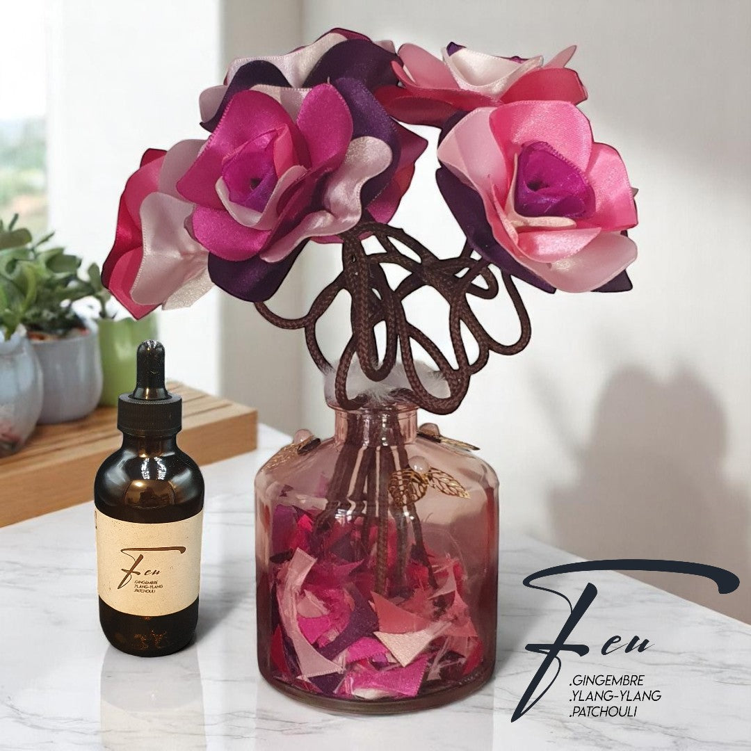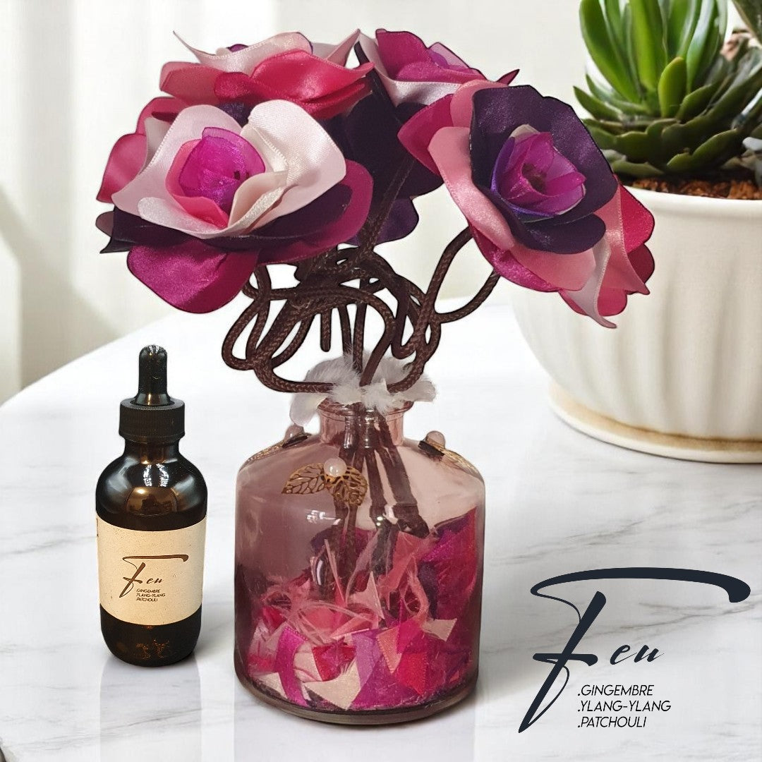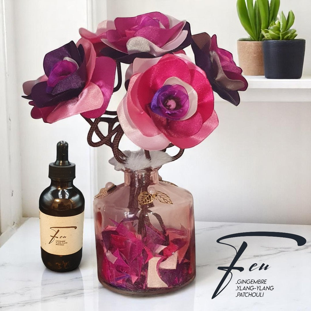 Vase avec 7 fleurs en satin ET Flacon Parfum Spray PET 100 ml.