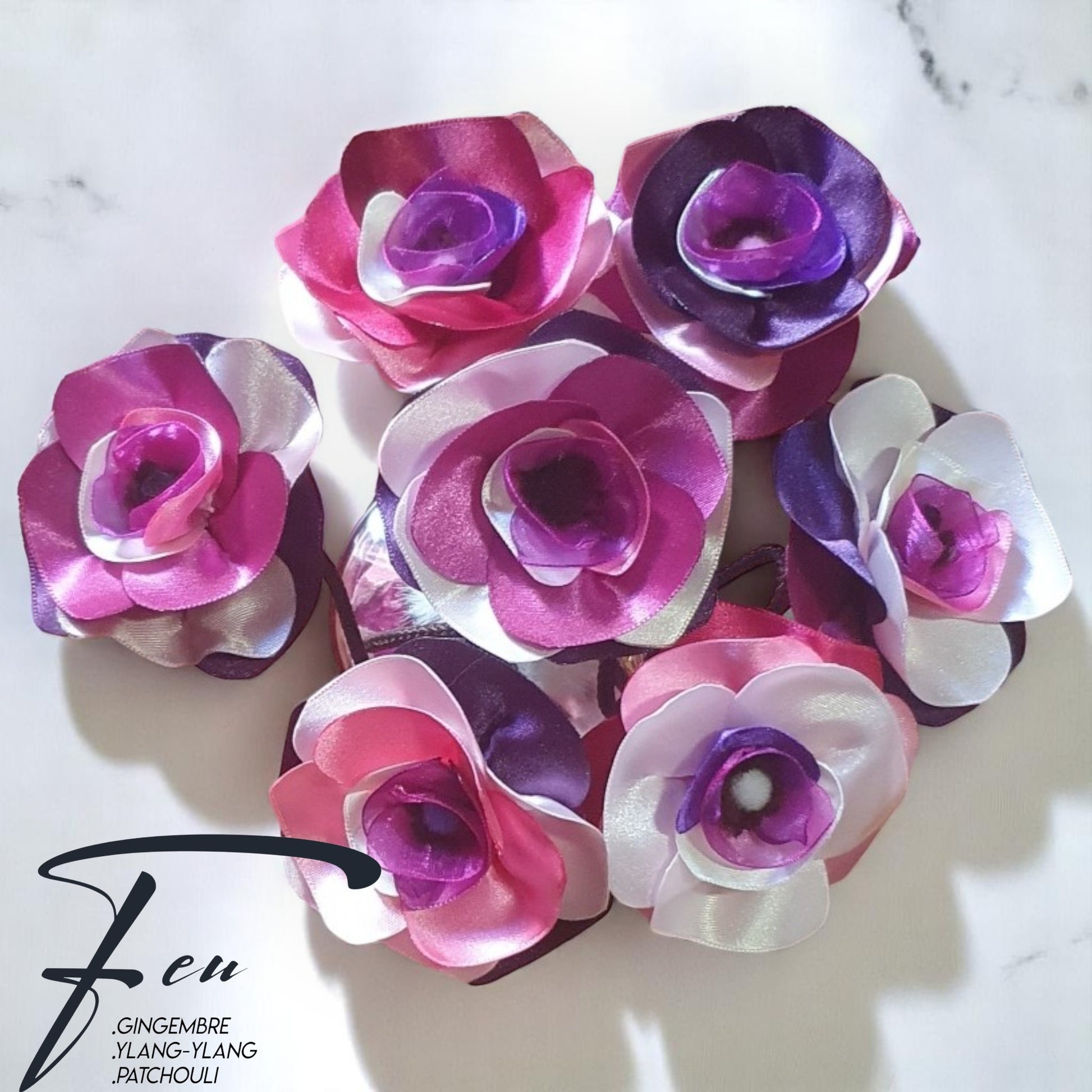 Tous est fabriqué de façon Artisanal à la main, les fleurs sont créées avec du satin de qualité supérieur , les parfums sont entièrement Naturel, ils sont élaborés confectionnés étiquetés en flacons sur place.
