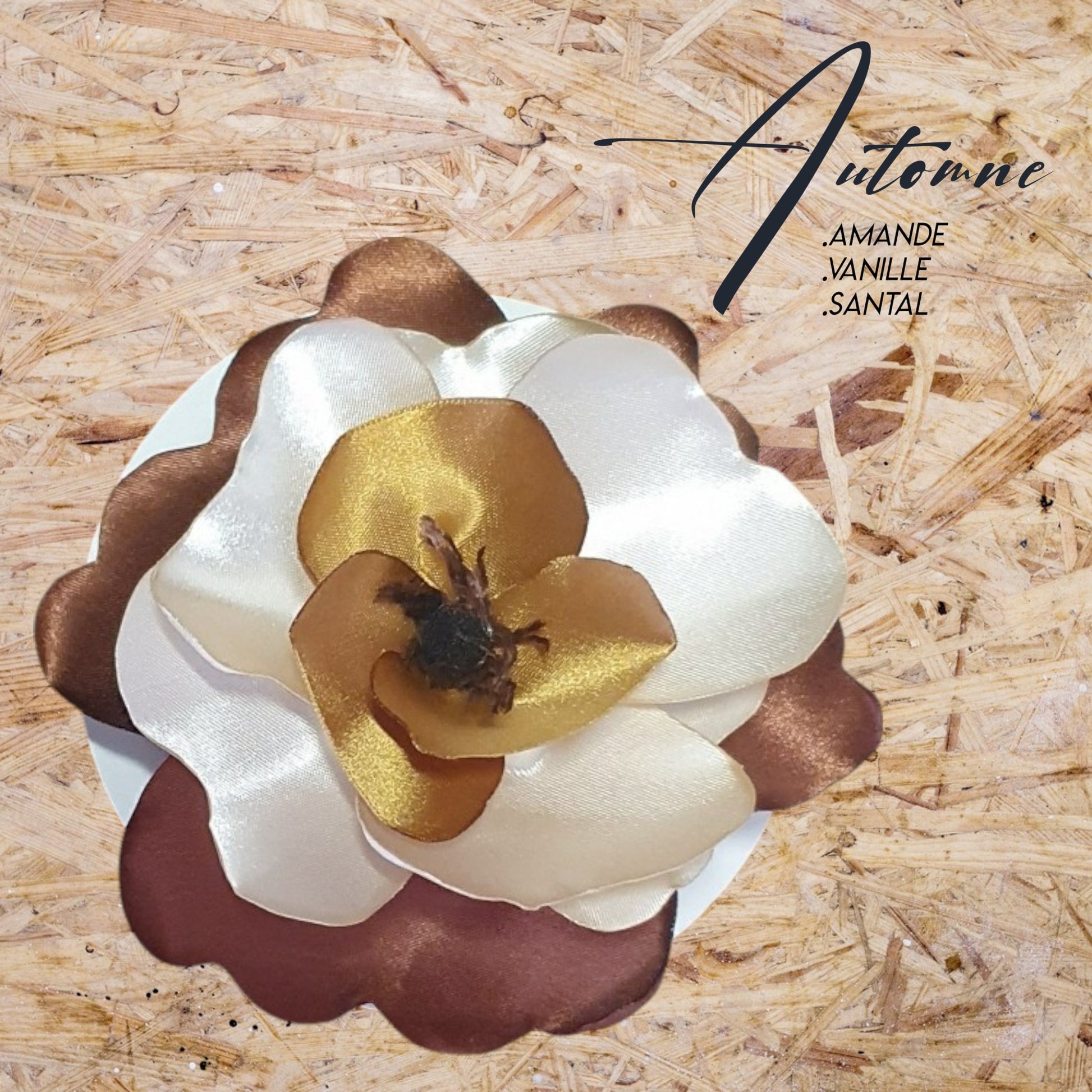 La fleur est confectionnée avec du satin de qualité supérieur elle est ajoutée à une pastille de feutre qui permet de prolonger le parfum. Les parfums sont élaborés de façon entièrement naturel puis mis en flacon sur place.