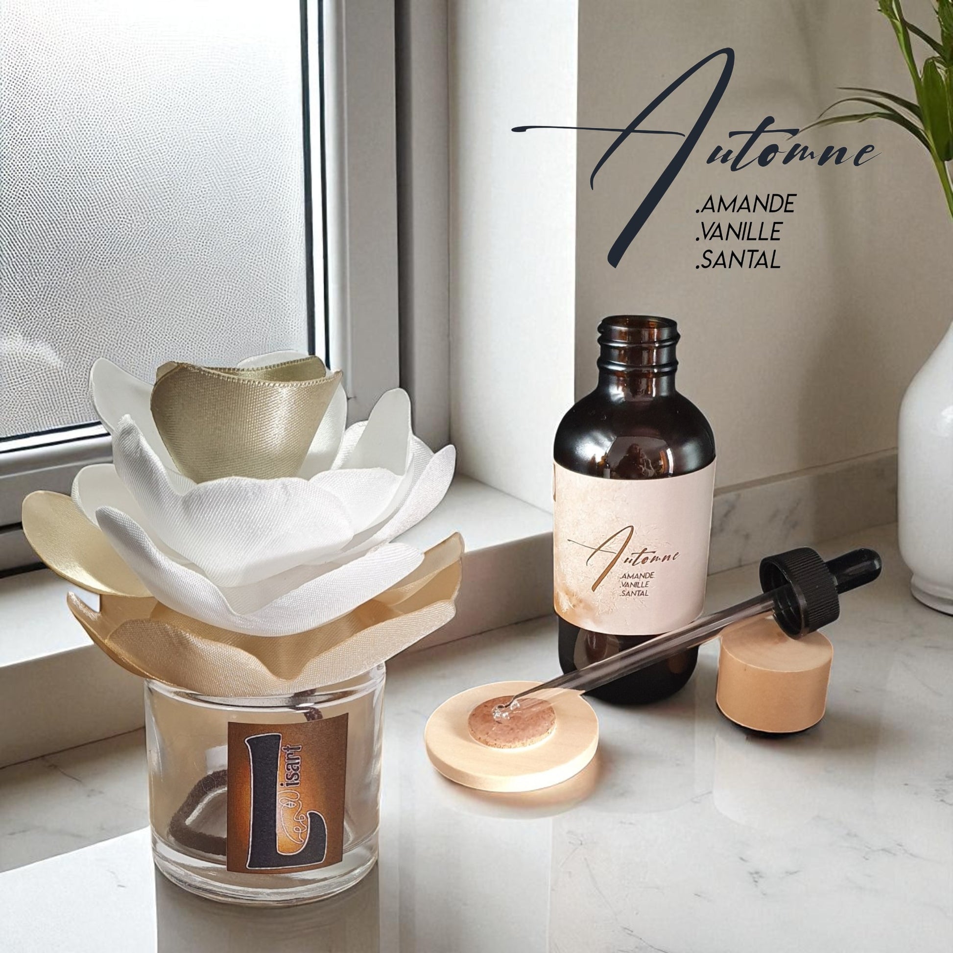 Pot diffuseur 50 ml avec Fleur xxl et Flacon pipette en verre 100 ml.