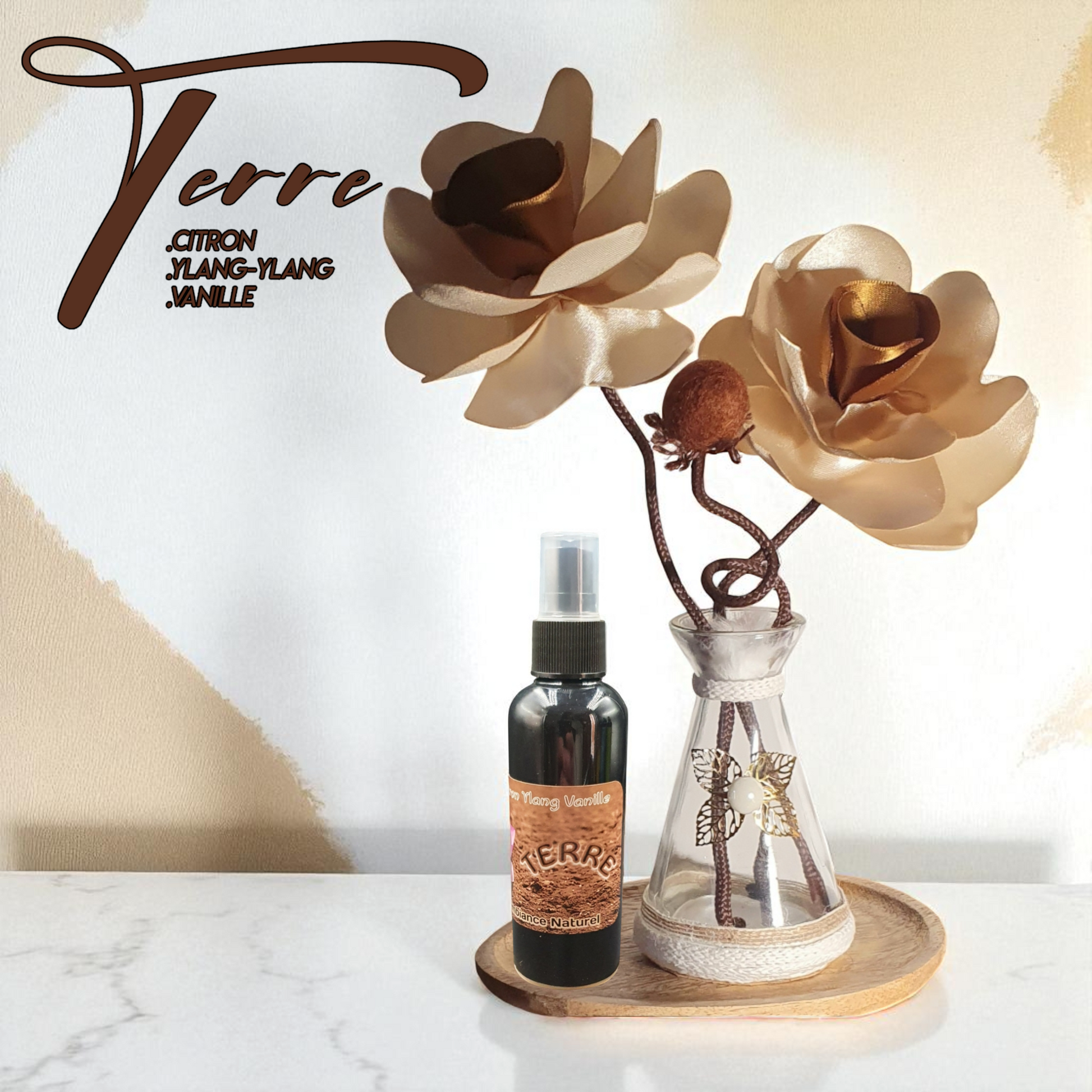 Vase avec 2 fleurs en satin, bourgeon et Flacon Parfum d'Ambiance Spray en PET 100 ml.