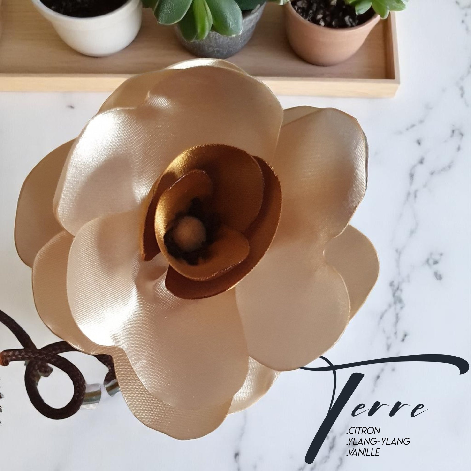 Tous est fabriqué de façon Artisanal à la main, les fleurs sont créées avec du satin de qualité supérieur , les parfums sont entièrement Naturel, ils sont élaborés confectionnés étiquetés en flacons sur place.