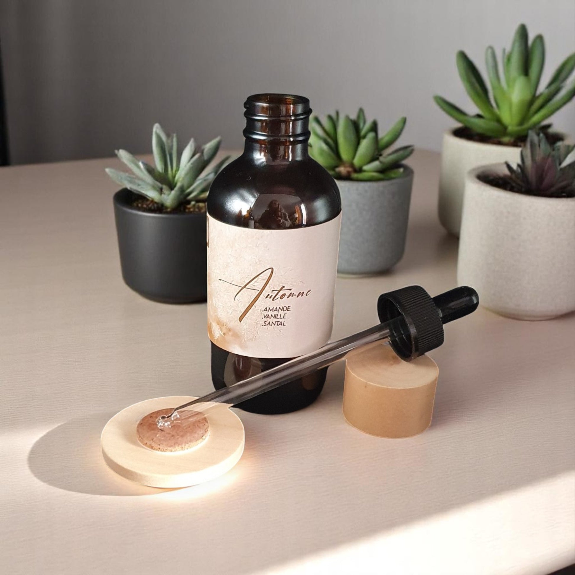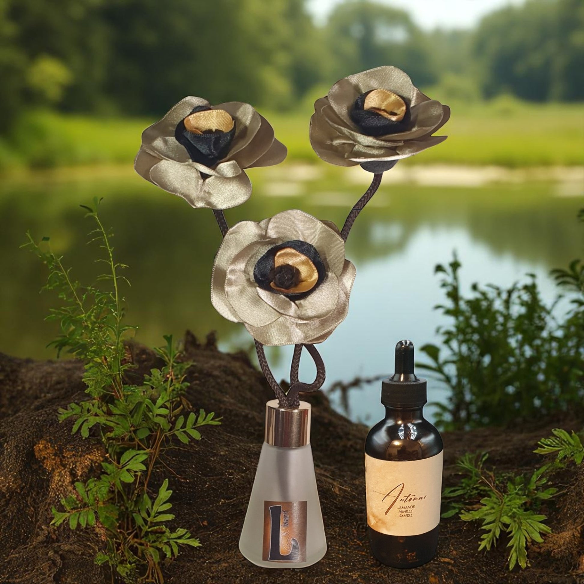 Pot diffuseur 50 ml avec 3 Fleurs et Flacon pipette en verre 130 ml.