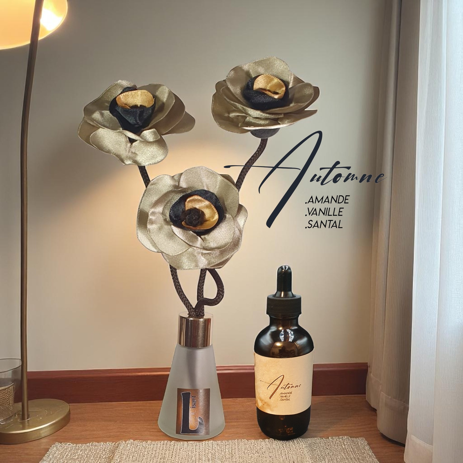 Les fleurs sont confectionnées avec du satin de qualité supérieur elles sont ajoutées à une pastille de feutre qui permet de prolonger le parfum. Les parfums sont élaborés de façon entièrement naturel puis mis en flacon sur place.