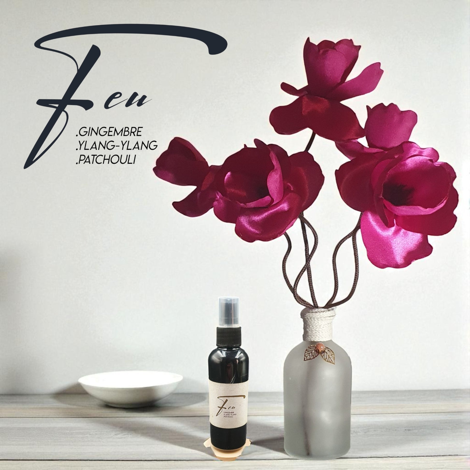 Vase avec 5 fleurs en satin et Flacon Parfum d'Ambiance Spray en PET 100 ml.