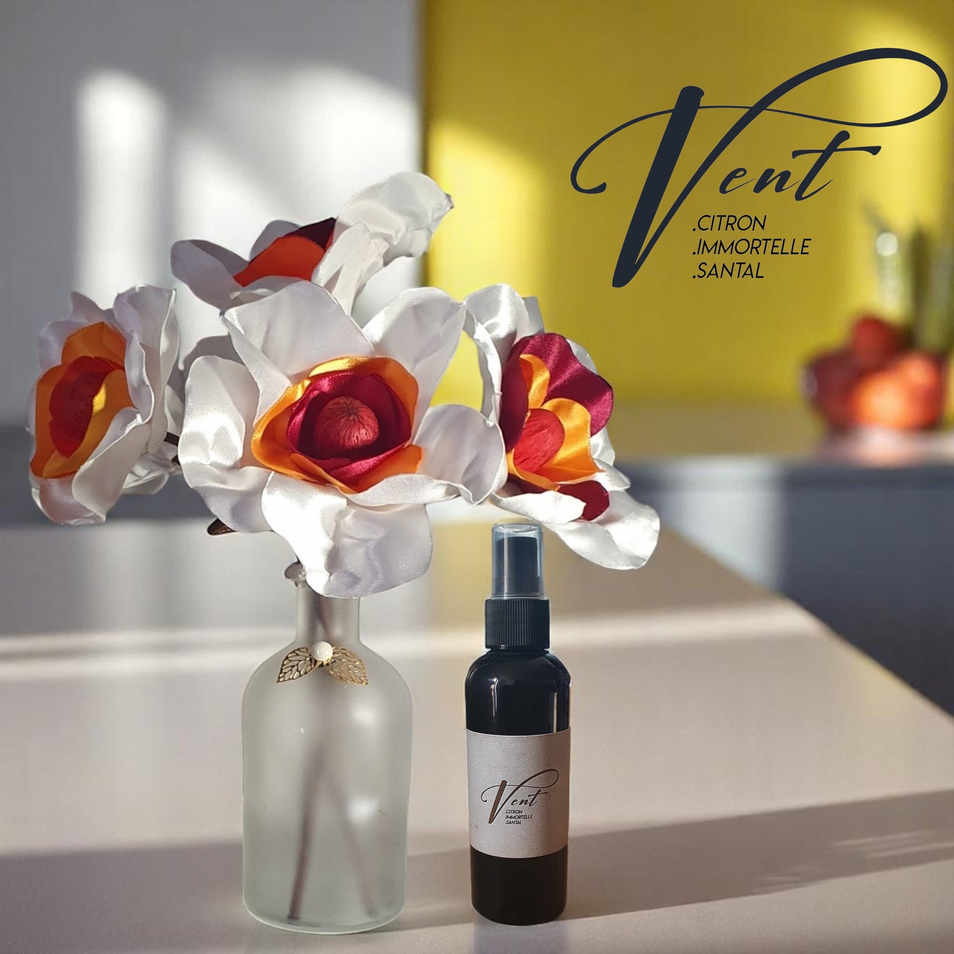 Vase avec 6 fleurs en satin + Flacon Parfum spray 100 ml.