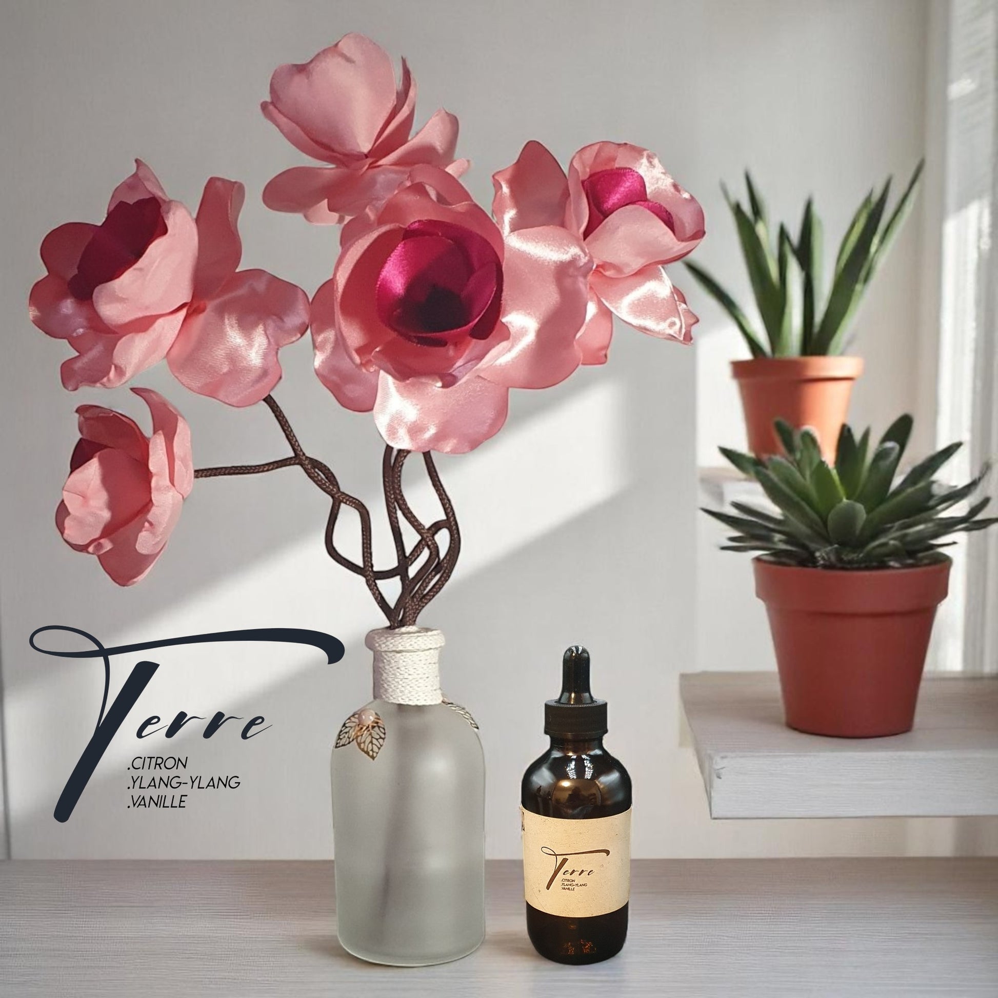 Vase avec 5 fleurs en satin + Flacon Parfum pipette en verre 120 ml.