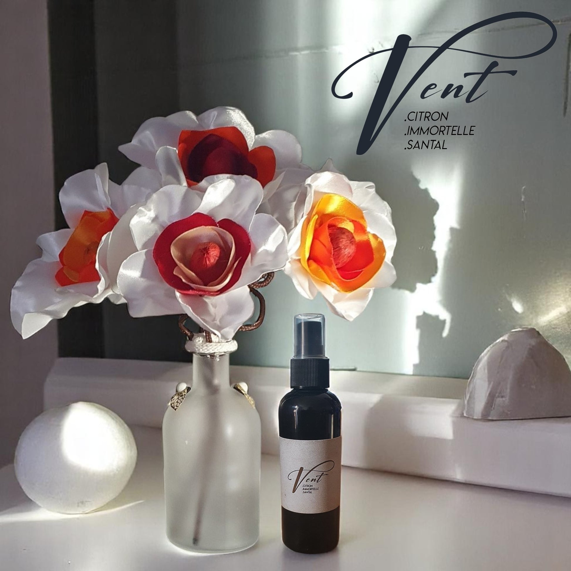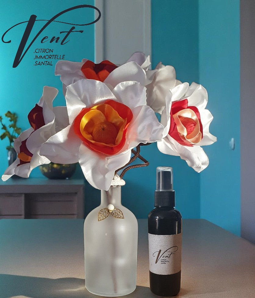 Vase avec 6 fleurs en satin et Flacon Parfum d'Ambiance Spray en PET 100 ml.